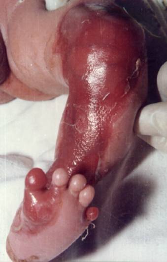 1. 出生时发现皮损,为圆形或椭圆形限局性红色肉芽组织,境界清楚,有时表面覆有大疱。