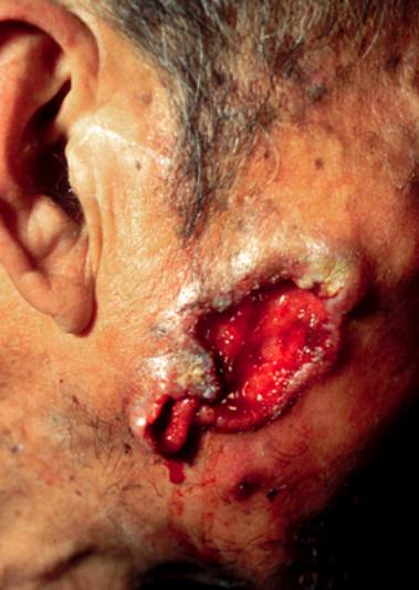 4.早期损害为红色硬结,以后逐渐发展成斑块或疣状损害,有浸润感,表面常有溃疡、结痂。如发生转移则相应淋巴结肿大。