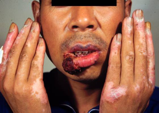 2.以头面部、下唇粘膜、颈和手背等处较常见。