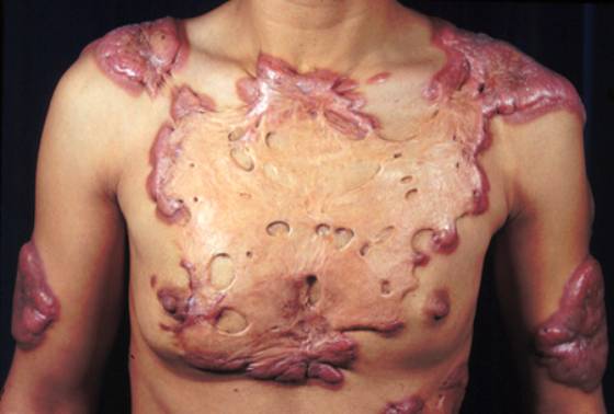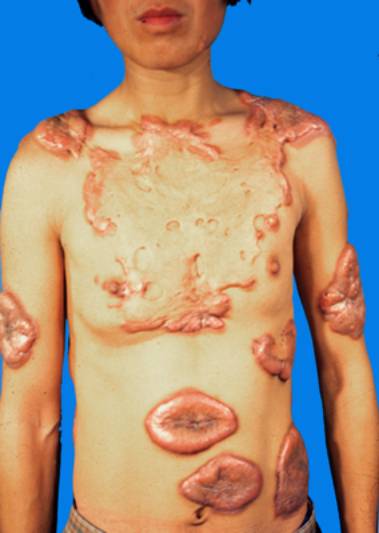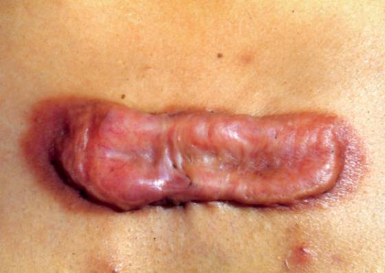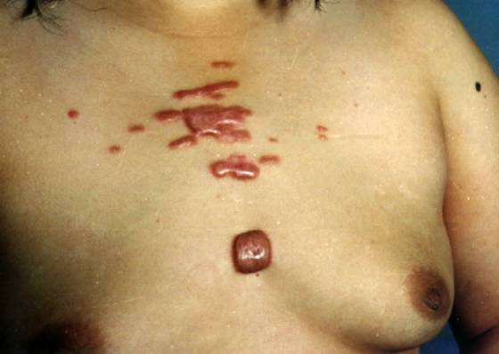 2. 皮损初为粉红色丘疹,逐渐增大形成隆起性斑块,边界清楚,外形不规则,有时呈蟹状,超过外伤区域,表面光滑、无毛。