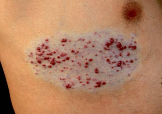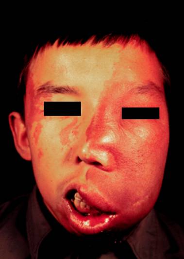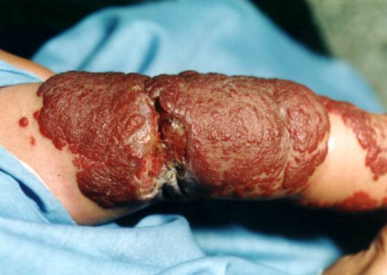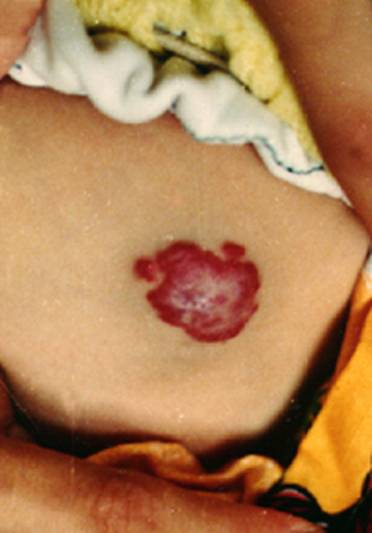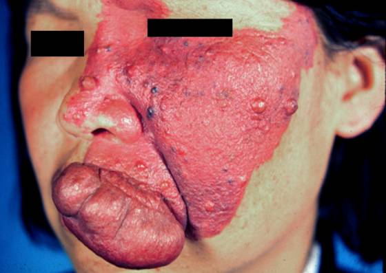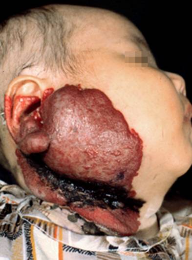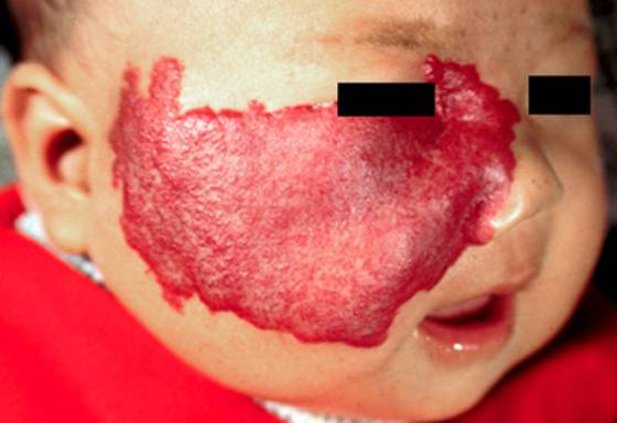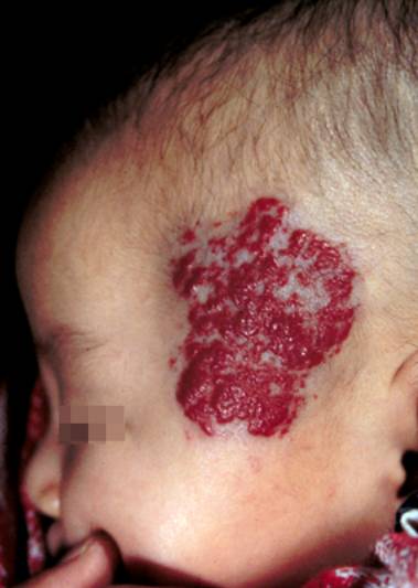 3.常为暗红或青紫隆起性皮下肿块,质软,易于压缩,形状不规则,大小不等,有时可与鲜红斑痣混合发生,图7,8。