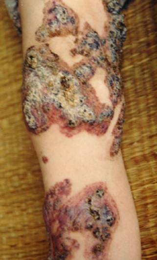 3.皮损为孤立的蓝红色结节,表面呈不规则的疣状。可播散,有时形成卫星状结节。