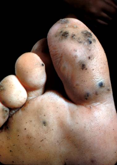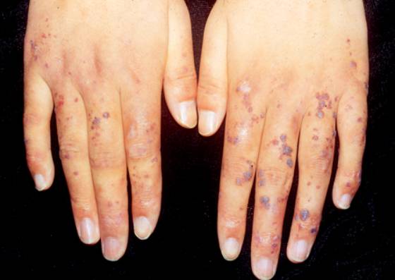 1. 典型皮损为紫红色或暗紫色丘疹,直径1~8mm不等,表面粗糙或呈疣状。