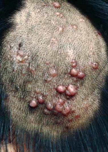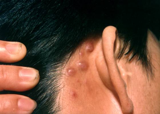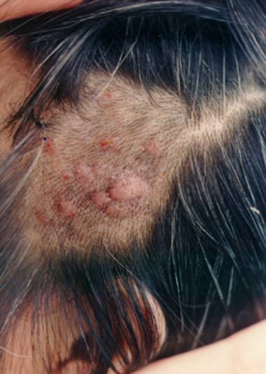 2. 皮损好发于头颈部,特别是耳廓及其附近,后枕部等处。