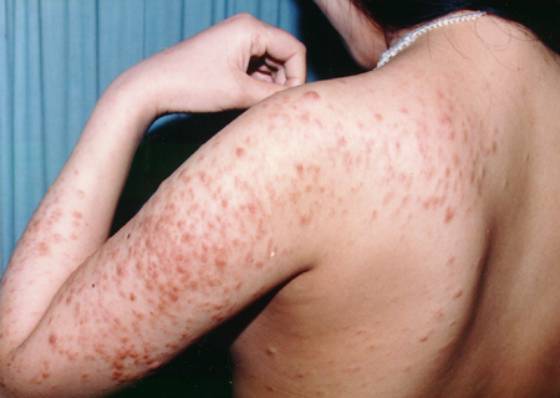 3. 多发者为1~5mm褐色或蓝色结节,质硬,成群或融合成斑块,好发于背、面及四肢伸侧。