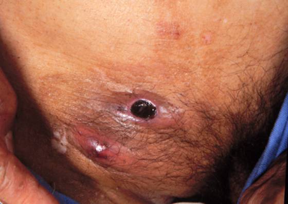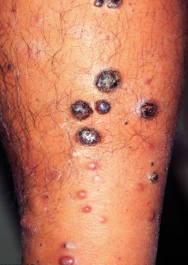 2. 皮肤表现为多发性黑色或红色结节,多经淋巴管及血行转移。图1示足部黑素瘤沿淋巴管转移至小腿皮肤;图3示转移至腹股沟淋巴结,出现坏死和破溃。