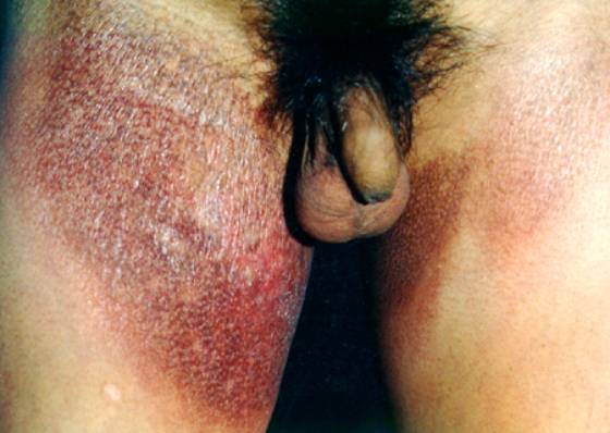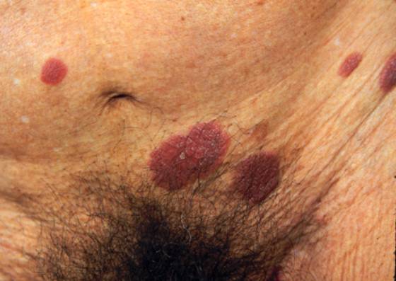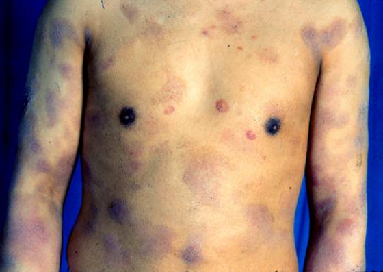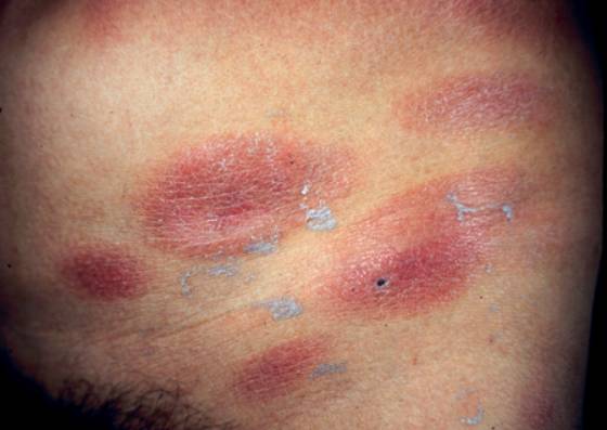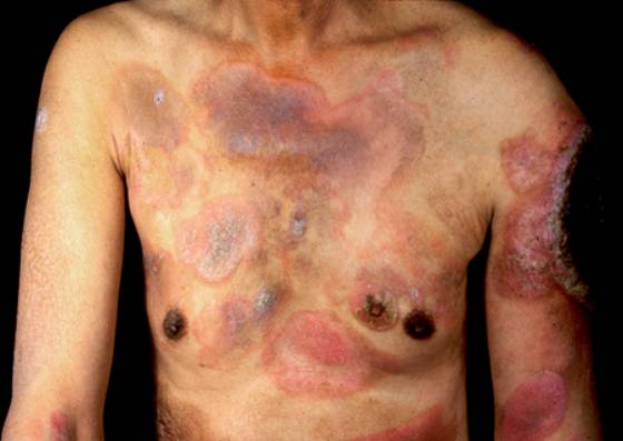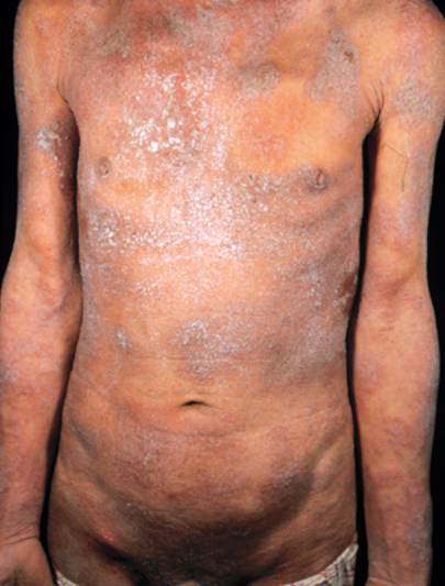 1.红斑期 皮疹呈多形性,可出现红斑、丘疹、斑片、苔藓样变等,但以红色或红褐色斑片最常见,表面附有鳞屑,境界清楚,椭圆或不规则,主要见于躯干,伴明显瘙痒。此期可持续数年。