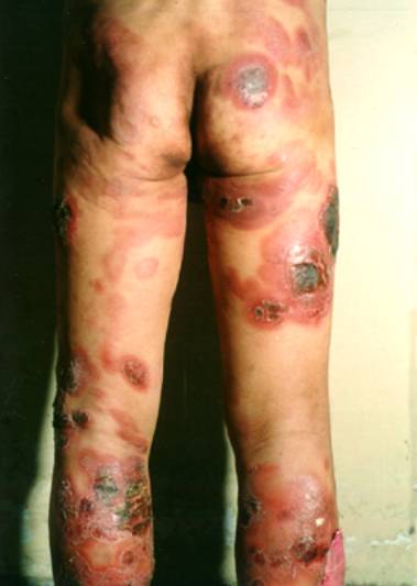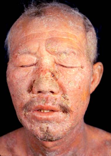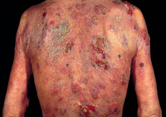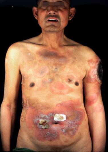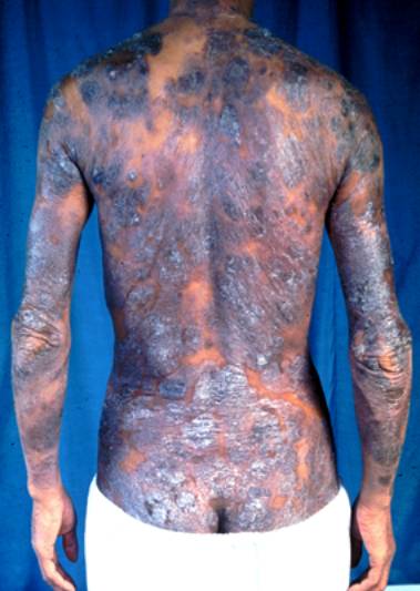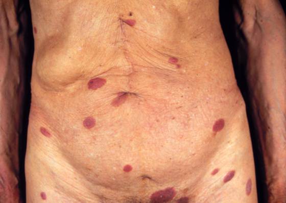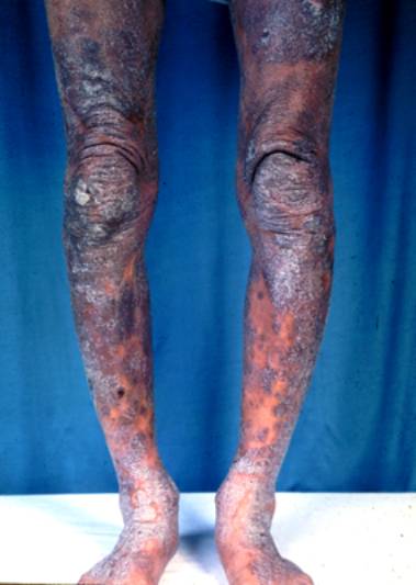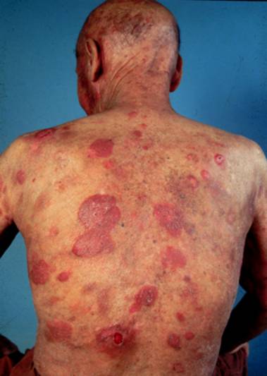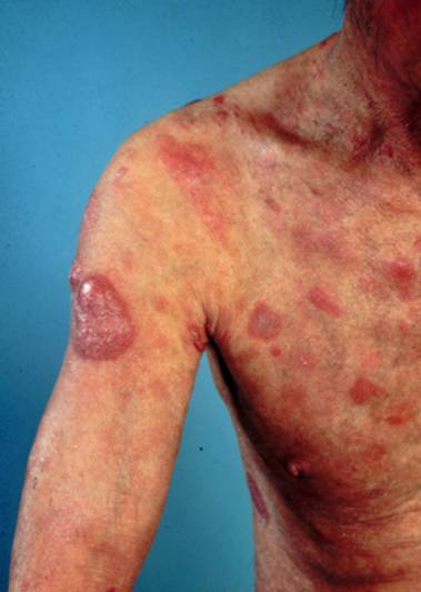 2.斑块期 主要为浸润性斑块或结节。表面光亮,高低不平,红色、黄红色或褐色。瘙痒减轻。浅表淋巴结可肿大。