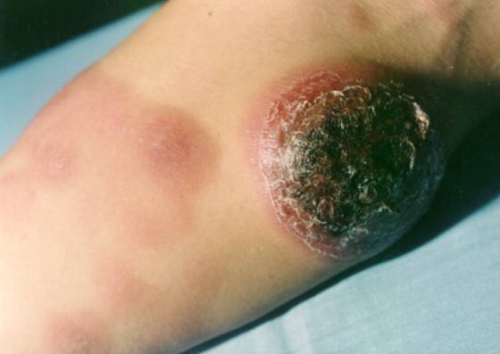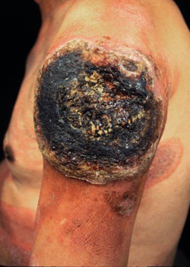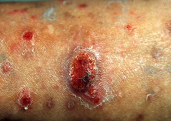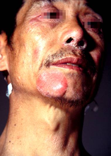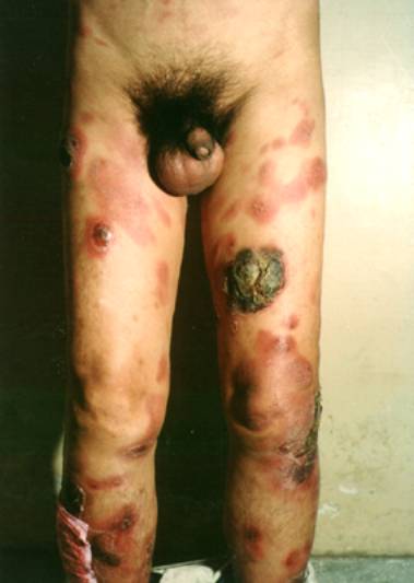 3.肿瘤期 多从斑块期发展而来。肿瘤为隆起的斑块、结节或肿块,半球状或分叶状,黄红或棕红色,可破溃。