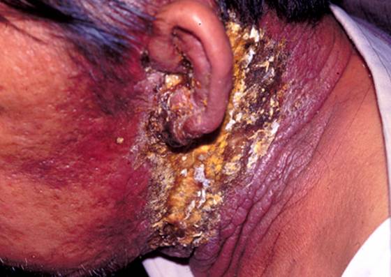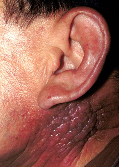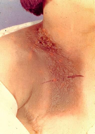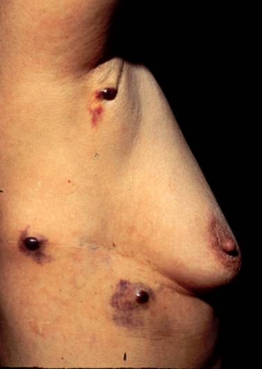 3. 类丹毒性或炎性损害,局部红肿,有丘疹、结节、浸润和出血性水疱,皮温高,境界清,多见于乳癌转移,图3。