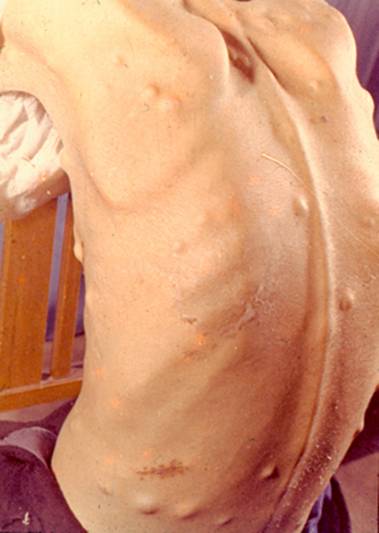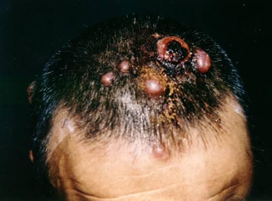 2. 无症状性皮下结节,皮色或紫红色,可发生任何部位,头皮转移多见于乳腺癌和肾癌,图4为肺癌转移;腹壁转移多见于消化道癌和肾癌, 图7。