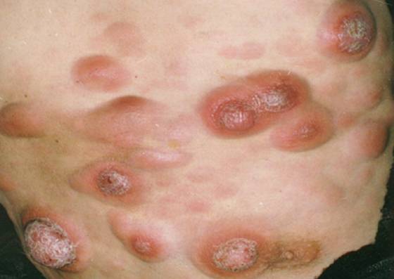 2.白血病皮疹:特异性皮疹常多发,好发于躯干、四肢,可为结节、斑块、红皮病或扁平苔藓样,呈黄棕色或青红色,成批出现,多达百个以上。粒细胞白血病可见绿色瘤。非特异性皮疹即白血病疹,可表现为斑疹、丘疹、水疱、紫癜、风团、结节等,常伴剧痒。